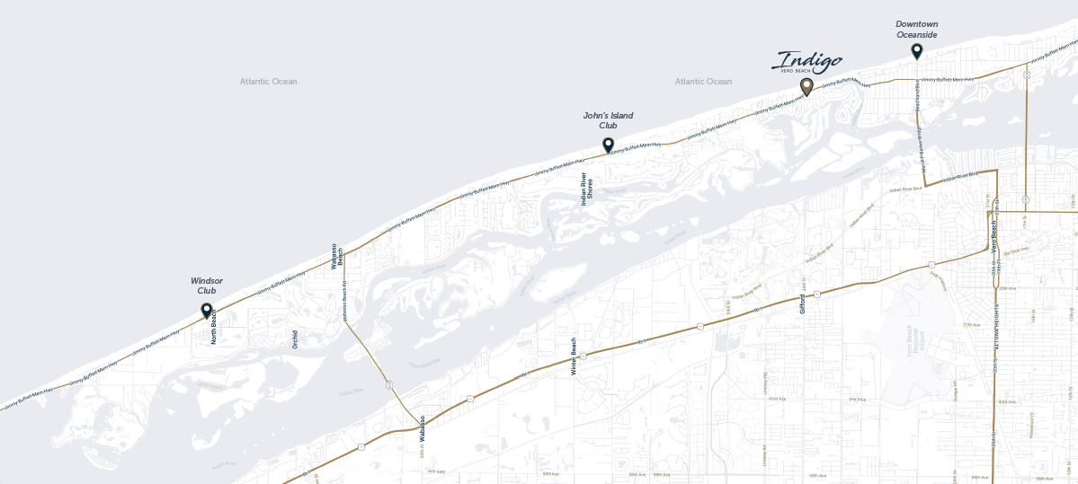 Perfectly positioned just south of John’s Island and Windsor on Vero Beach’s barrier island, Indigo Vero Beach offers an exceptional balance of privacy and connection. Boutique shopping, cultural arts, pristine parks, recreation, exclusive resorts, and renowned dining along Ocean Drive are all just moments away by foot, bicycle, or golf cart—while convenient air access to major markets makes every arrival effortless. Within minutes, you’re oceanfront, unwinding with the horizon stretched endlessly before you.